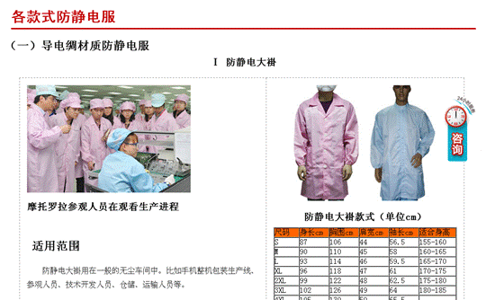 防静电大褂一般用在防静电要求不太高、对洁净度没有特殊要求的洁净室生产环境中。比如手机制造厂生产手机外壳的环境就可以穿防静电大褂,为节约生产成本,没必要穿无尘服或防静电分体服。