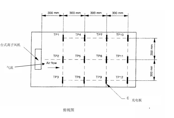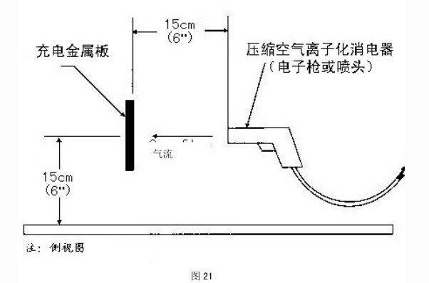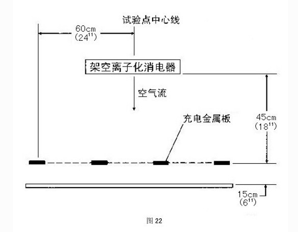 将测试仪和离子静电消除器按图20所示放置,(压缩气体离子枪测试位置见图21,高架电离器测试位置见图 22)将测试仪充电板充规定电压,打开静电消除器电源,使充电极板暴露在电离气流中,关闭充电电源同时监测极板电压降至约定电压时的静电衰减时间。然后在中心线每个测试点监测残余电压。