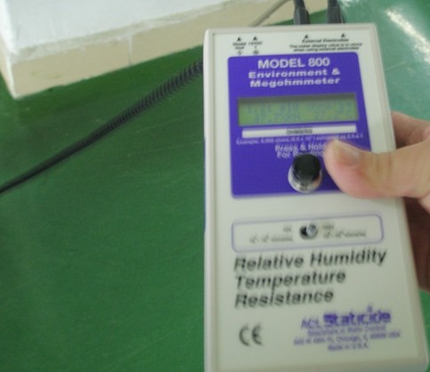 检测人员正在检测防静电环氧地板,测量结果已经超标,建议客户对防静电环氧地板进行防静电补救措施,地面清洁后可以刷防静电地板蜡。
