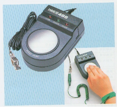 3) 在按下金属按纽后,若测试仪表上的绿色“GOOD”指示灯亮,表示腕带正常;若仪表上红色的“HIGH”或“LOW”指示灯亮,检查确认腕带穿戴和操作正常无误后,表明腕带已损坏,需重新领取新腕带,领出新的防静电腕带后再按前述测试方法进行测试。