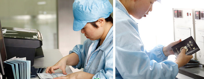 电子护照,是在传统护照的封面或者当中的某一页嵌入电子芯片,持照人的姓名、性别、出生日期、照片图像、指纹等个人信息储存在芯片内。“电子护照技术含量高,制作工艺标准严苛,车间要求达到工作场地严格的无尘净化标准,才能生产出高质量的产品。” 在进入制证车间之前,先要穿上防尘鞋套,车间门口就安放有自动鞋套机。走进了一个两端都有门的“风淋室”,它能迅速清除附着在衣服上的灰尘、头发、发屑等杂物。每一位工作人员和外来人员进入洁净室无尘车间之前,都要通过风淋间“净化”。风淋室的两道门电子互锁,可以兼起气闸室的作用,阻止外界污染和未被净化的空气进入洁净区域。 过风淋间的“洗礼”,进入到制证主车间。近600平方米的主空间整洁明净。地板专门经过防静电处理,能最大程度减少灰尘、毛发、纤维甚至皮屑。