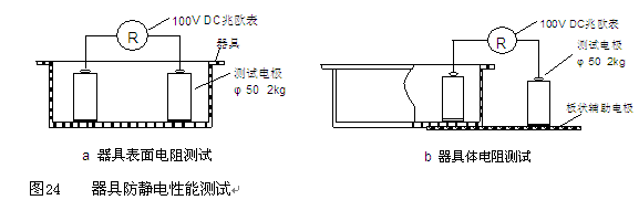 按照图24,用兆欧表测试器具的表面电阻和体积电阻。