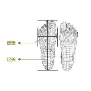 右的两个点连接起来即为正确的脚长宽。双脚都要量一下,取最大的值。