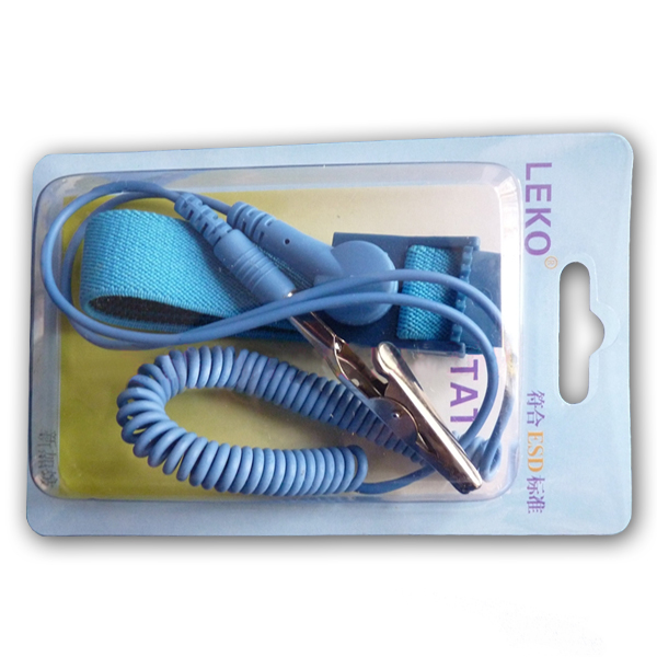 ESD手腕带(ESD wrist strap)组成: 1、卷线:PU材质; 2、鳄鱼夹:不锈钢活动夹; 3、导电纱布:纤细导电纱编织。