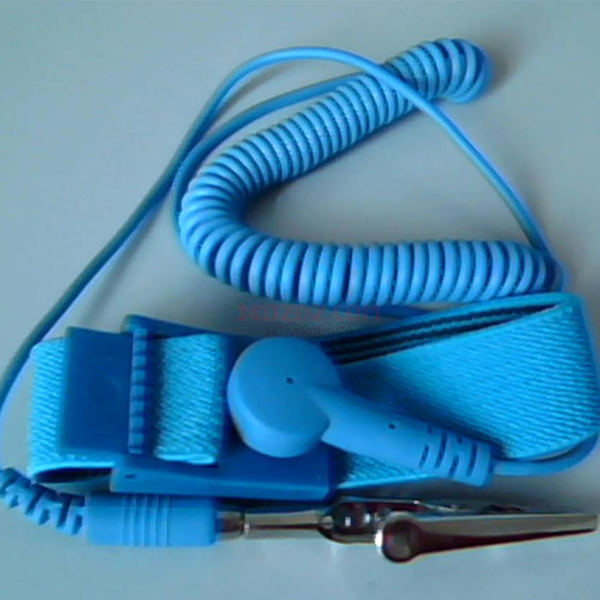 ESD手腕带组成: 1、卷线:高弹性防摇摆,蓝色; 2、鳄鱼夹:不锈钢活动夹; 3、导电纱布:纤细导电纱编织,黑纱。