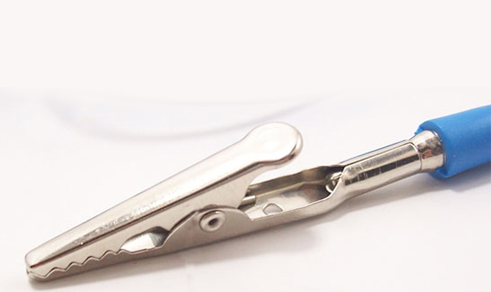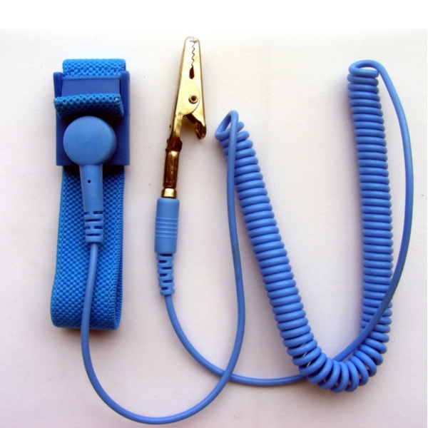 ESD手腕带组成: 1、卷线:高弹性防摇摆,蓝色; 2、鳄鱼夹:不锈钢活动夹; 3、导电纱布:纤细导电纱编织,白纱。