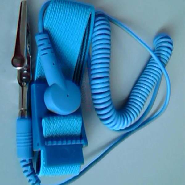 ESD手腕带组成: 1、卷线:高弹性防摇摆,蓝色; 2、鳄鱼夹:不锈钢活动夹; 3、导电纱布:纤细导电纱编织,白纱。