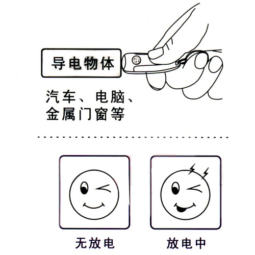 本款静电消除器是接触式消除静电,不需要电池,长期使用。在需要消除静电时,手握产品,用本款静电消除器的黑色胶头部分接触导体(例如门、水龙头、金属壳体、汽车、墙壁等)就可以消除人体及被接触物体双方当时所带的静电,消除静电时屏幕变换显示。