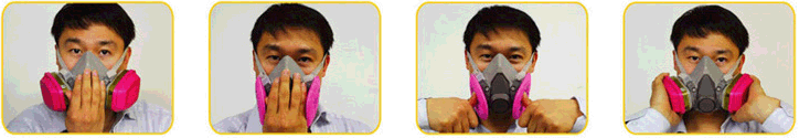 滤棉使用者拇指抵住滤棉的中心部分,轻轻呼吸。面具应有轻微的塌陷,并向脸部靠拢。如感觉气体从面部及面具间漏进。请重新调整面具位置并调节头带的松紧度,以达到密合良好。如果面具不能与面部密合良好,请勿进入污染的区域。